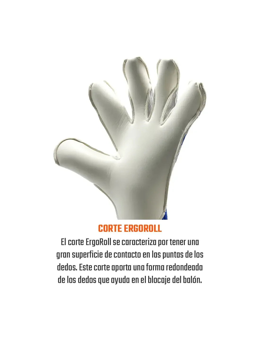 El corte Ergoroll envuelve los dedos con látex, aumentando la superficie de contacto con el balón y mejorando la sensación de control en blocajes y despejes.