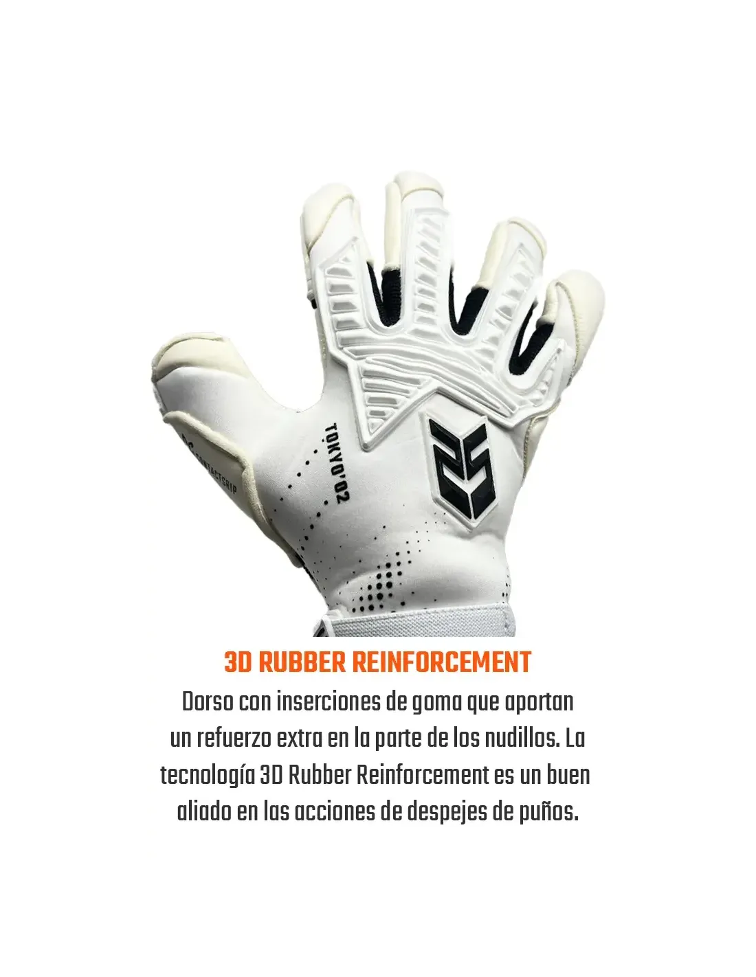 Dorso fabricado en neopreno flexible con refuerzos 3D Rubber, diseñado para aportar protección en despejes de puños sin limitar la movilidad de la mano.