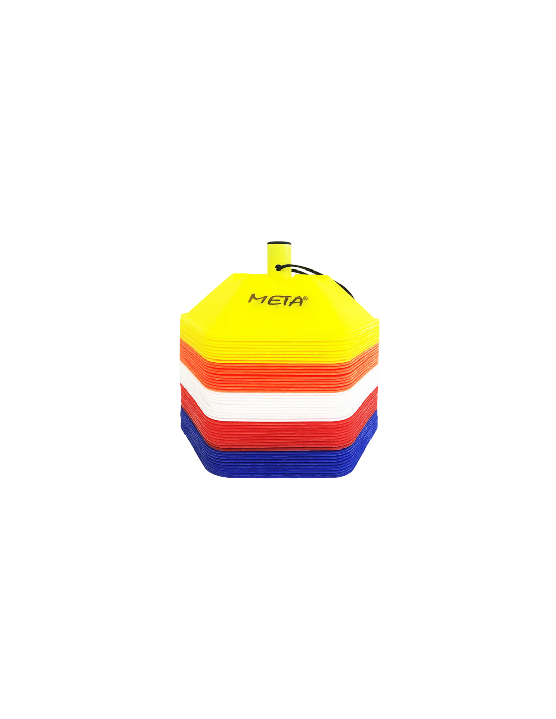 Una serie di coni cinesi con a Design ottagonale innovative. Ogni cono cinese è realizzato in plastica morbida. I coni cinesi in questo modo possono essere combinati con picche di diverse altezze per creare recinzioni per la formazione. Ogni cono cinese ha un Altezza di 5 cm. e una larghezza di 20 cm. Il set include uno speciale supporto in plastica con una cinghia per facilitare lo stoccaggio e il trasporto. Il numero totale di coni cinesi del Set è 50 unità.